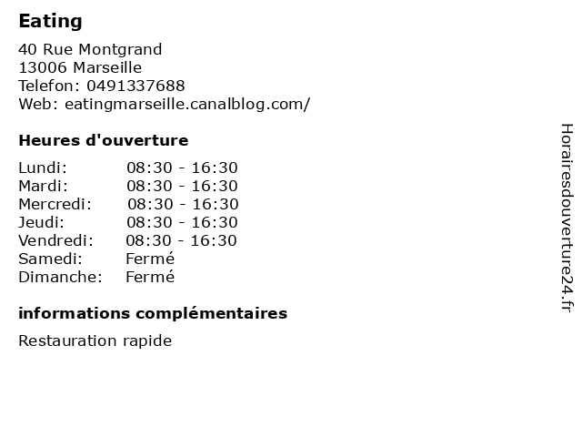 | Lundi | 08:30-16:30 |