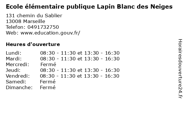 2 Ecole maternelle publique Lapin Blanc des Neiges (Distance: 0,09 km) 21 boulevard des Neiges, 13008 Marseille blanc, cio, college, cours, des, ecole, education, elementaire, enseignement, lapin, lycee, maternelle, nationale, neiges, orientation, primaire, privé, privée, public, publique 3 Ecole maternelle publique Lapin Blanc (Distance: 0,51 km) 70 Avenue André Zenatti, 13008 Marseille blanc, cio, college, cours, ecole, education, elementaire, enseignement, lapin, lycee, maternelle, nationale, orientation, primaire, privé, privée, public, publique 4 Ecole élémentaire publique Lapin Blanc (Distance: 0,51 km) 70 avenue André Zenatti, 13008 Marseille blanc, cio, college, cours, ecole, education, elementaire, enseignement, lapin, lycee, maternelle, nationale, orientation, primaire, prive, privee, public, publique, élémentaire 5 École élémentaire publique Émile Loubet (Distance: 4,94 km) - Castellane, 26230 Grignan ecole, education, loubet, maternelle, publique, services, école, élémentaire, émile 6 Ecole élémentaire publique Révolution (Distance: 7,39 km) 38 rue du Jet d'Eau, 13003 Marseille cio, college, cours, ecole, education, elementaire, enseignement, lycee, maternelle, nationale, orientation, primaire, privé, privée, public, publique, révolution, élémentaire |