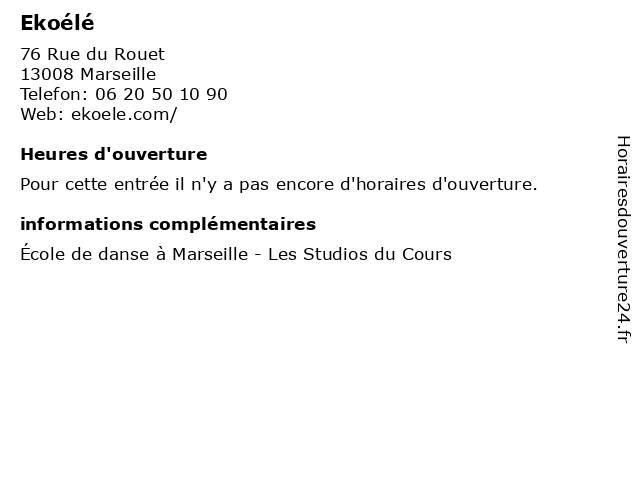 1 Les Studios du Cours (Distance: nan km) 76 Rue du Rouet, 13008 Marseille académie, cours, course, danse, du, les, studios, école 2 Mélodie 7 - Écoles des arts du spectacle (Distance: 0,01 km) 78 Rue du Rouet, 13008 Marseille académie, arts, cours, danse, des, du, mélodie, spectacle, studio, Écoles, école 3 Orchestra Studio Marseille (Distance: 0,32 km) 17 Rue Pierre Dupré, 13008 Marseille académie, cours, danse, marseille, orchestra, studio, école 4 Repetto - MADEMOISELLE DANSE (Distance: 0,32 km) 11 rue de Cassis, 13008 Marseille chaussures, danse, garde-robe, mademoiselle, maroquinerie, parfum, repetto 5 Life Club / Activités - Danse orientale (Distance: 0,57 km) 40 rue du Dr escat, 13006 Marseille activités, club, danse, exercise, fitness, health, life, orientale, outdoor, physical activities, sports 6 L'École du Ballet (Distance: 0,68 km) 20 Rue de Madagascar, 13006 Marseille académie, ballet, cours, danse, du, l'École, l'école, école |