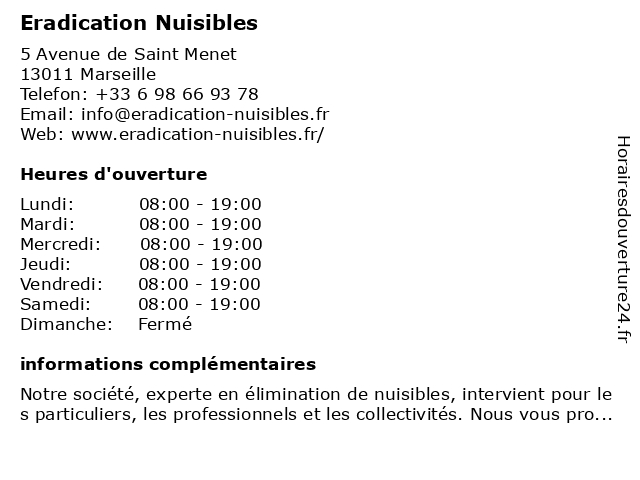 2 Sud Nuisibles Hygiène et Services (Distance: 4,74 km) 23 Avenue William Booth, 13011 Marseille et, hygiène, nuisibles, services, sud 4 Attrap 13 Nuisibles (Distance: 7,54 km) 33 Rue Frédéric Joliot Curie, 13013 Marseille 13, antiparasitaire, attrap, detection, extermination, lutte, nuisibles, stérilisation 6 NGAN MARSEILLE ET VAR - Entreprise Anti-Nuisibles (Distance: 8,49 km) 128 Boulevard de la Libération, 13004 Marseille anti, entreprise, et, marseille, ngan, nuisibles, var |