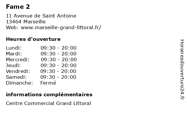 1 Fame (Distance: 0,00 km) 11 Avenue de Saint Antoine, 13464 Marseille beaute, chaussures, deco, enfants, fame, mode femmes, mode hommes, restaurant, sport 2 Fame (Distance: 0,62 km) 15 Avenue de Saint Antoine, 13015 Marseille boutique, fame, féminin, masculin, mode, prêt-à-porter 3 Fame (Distance: 6,45 km) 2 Rue de Lisbonne, 13480 Cabries beaute &sante, bijoux, boutigue, decoration, fame, mode femmes, mode hommes, optique, restaurants, sport 4 Fame E-Shop (Distance: 12,97 km) 111 Route de la Valentine, 13011 Marseille accessoires, boutique, fame, femme, mode, shop, vêtements 5 La Bovéda (Distance: 47,41 km) 12 Rue Hoche, 83190 Ollioules boveda, bovéda, fame, fastfood, kebab, la, restaurants, tacos 6 H&M (Distance: 10,92 km) - Place du Général de Gaulle, 13100 Aix en Provence enfants, h&m, hommes, la mode, la qualité, magasins de mode pour femmes |