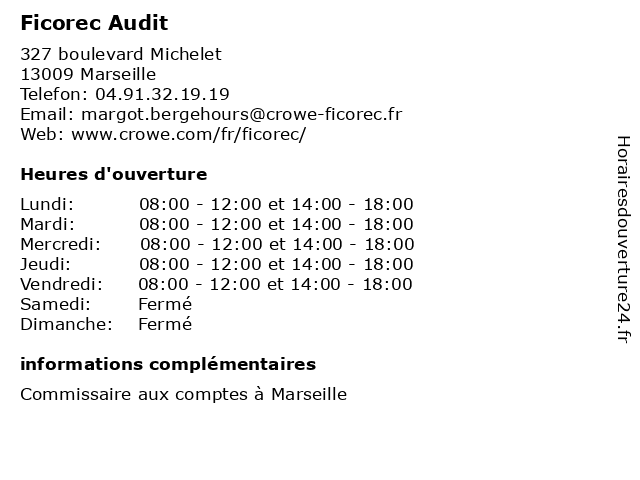 2 Ficorec Tetra (Distance: 4,82 km) 31 avenue de Garlaban, 13012 Marseille audit, comptable, conseil, consultants, ficorec, juridique, paie, patrimoine, social, tetra 3 PKF Audit Conseil (Distance: 4,95 km) 17 boulevard Augustin Cieussa, 13007 Marseille audit, commissaire, comptable, comptes, conseil, expert, pkf 4 AUDIT FORMA CONSEILEXPERT COMPTABLE (Distance: 8,18 km) 148 Avenue des Olives, 13013 Marseille audit, comptable, conseilexpert, forma 5 Audit'Ec - Expert-comptable (Distance: 12,03 km) 15 Avenue Gay Lussac, 13470 Carnoux-en-Provence audit'ec, comptable, création d'entreprises, expert, expert-comptable, fiscalité, gestion, juridique, paie 6 Ficorec Domiciliation Services (Distance: 17,28 km) 515 Avenue de la Tramontane, 13600 La Ciotat domiciliation, ficorec, services |