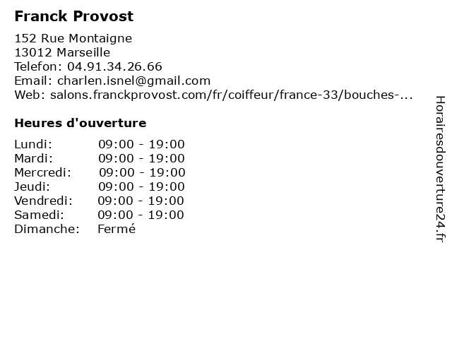 1 Franck Provost (Distance: 1,80 km) 204 Boulevard De La Liberation, 13004 Marseille beauté, cheveux, coiffure, franck, provost, salon, service 2 Franck Provost (Distance: 3,42 km) 17 Cours Belsunce, 13001 Marseille coiffeur, coiffure, franck, provost, salon 3 Franck Provost (Distance: 4,32 km) 9 Quai du Lazaret, 13002 Marseille coiffure, franck, provost, salon 4 Franck Provost (Distance: 4,49 km) 36 Rue d'Endoume, 13007 Marseille expertise beauté, franck, la marque, provost, tendance coiffure, événement 5 Franck Provost (Distance: 5,12 km) 69 Route de la Sabliere, 13011 Marseille expertise beauté, franck, la marque, provost, tendance coiffure, événement 6 Franck Provost (Distance: 5,36 km) 382 Avenue de Mazargues, 13008 Marseille expertise beauté, franck, la marque, provost, tendance coiffure, événement |