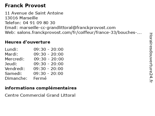 1 Franck Provost (Distance: 0,16 km) 11 Avenue de Saint Antoine, 13464 Marseille beaute, chaussures, deco, enfants, franck, mode femmes, mode hommes, provost, restaurant, sport 2 Franck Provost (Distance: 5,60 km) 113 Route Nationale, 13127 Vitrolles accessories, cafe, costume, franck, homme, mode, pantalons, provost, pulls, restaurant, service 3 Franck Provost (Distance: 6,59 km) 2 Rue de Lisbonne, 13480 Cabries beaute &sante, bijoux, boutigue, decoration, franck, mode femmes, mode hommes, optique, provost, restaurants, sport 4 Franck Provost (Distance: 8,31 km) 36 Rue d'Endoume, 13007 Marseille expertise beauté, franck, la marque, provost, tendance coiffure, événement 5 Franck Provost (Distance: 9,35 km) - Avenue Du General Montsabert,, 13190 Allauch expertise beauté, franck, la marque, provost, tendance coiffure, événement 6 Franck Provost (Distance: 10,92 km) n/a Route nationale 113, 13127 Vitrolles beauté, coiffeurs, franck, provost, santé, sport |