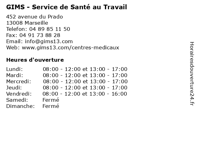 1 GIMS - Service de Santé au Travail (Distance: 2,20 km) 143 cours Lieutaud, 13006 Marseille au, bilan, castellane, centre, de, gims, professionnel, santé, service, travail 2 GIMS - Service de Santé au Travail (Distance: 3,39 km) 11 Rue de la République, 13002 Marseille au, centre, de, famille, gims, médical, santé, service, travail 3 GIMS - Service de Santé au Travail (Distance: 4,45 km) 25 rue Pontevès, 13002 Marseille au, bilan, centre, de, gims, joliette, la, professionnel, santé, service, travail 4 GIMS - Service de Santé au Travail (Distance: 7,86 km) 111 route de La Valentine, 13011 Marseille au, bilan, centre, de, gims, la, professionnel, santé, service, travail, valentine 5 GIMS - Service de Santé au Travail (Distance: 10,43 km) 11 avenue André Roussin, 13016 Marseille au, bilan, centre, de, gims, littoral, professionnel, santé, service, travail 6 GIMS - Service de Santé au Travail (Distance: 13,72 km) 5 avenue de la Viguerie, 13260 Cassis au, bilan, cassis, centre, de, gims, professionnel, santé, service, travail |