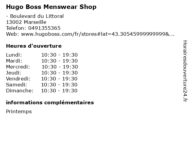 1 Hugo Boss Menswear Shop (Distance: 11,01 km) - Route de la Sablière, 13011 Marseille accessoires, boss, chaussures, hugo, magasins, menswear, shop, vêtements 3 Würth - Proxi Shop (Distance: 1,67 km) 14 Boulevard Ampère, 13014 Marseille electricité, proxi, services, shop, visserie, würth 4 HUGO BOSS, Menswear (Distance: 2,90 km) 9, Quai du Lazaret, 13001 Marseille accessoires, bags, boss, hugo, menswear, perfumes, shoes, watches, womenswear 5 Lycée Public Victor Hugo (Distance: 3,64 km) 3 boulevard Gustave Desplaces, 13003 Marseille cio, college, cours, ecole, education, elementaire, enseignement, hugo, lycee, lycée, maternelle, nationale, orientation, primaire, privé, privée, public, publique, victor 6 Cosmetic Hair Shop (Distance: 4,05 km) 77 Avenue Alexandre Ansaldi, 13014 Marseille accessoires, coiffure, cosmetic, fournisseur, hair, produits, shop |