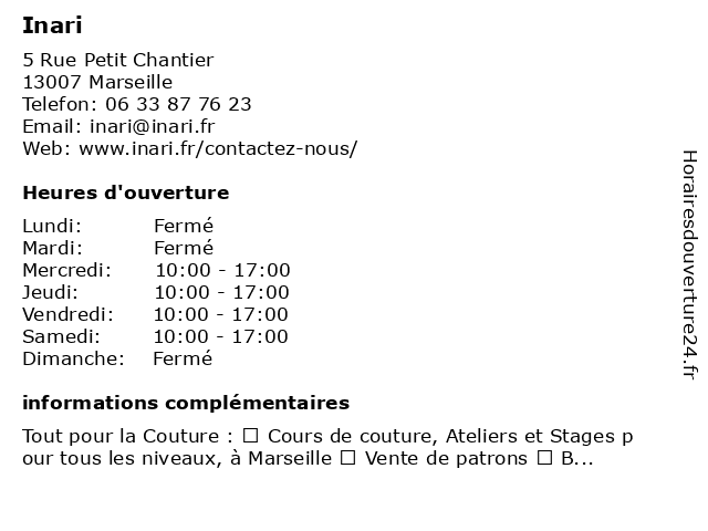 1 Michel Bonzi Couture (Distance: 0,36 km) 3 Boulevard Notre Dame, 13006 Marseille accessoires, bonzi, boutique, cocktail, couture, mariage, marié, michel, robes 2 Rapid Couture (Distance: 0,50 km) 40, rue E. Delanglade, 13006 MARSEILLE closing pose, couture, creation of custom clothing: shirts, custom embroidery, customization, dresses, pants, rapid, services, suits, women's clothing 3 Sur Toutes les Coutures (Distance: 0,70 km) 51 Rue Sauveur Tobelem, 13007 Marseille couture, coutures, laine, les, mercerie, sur, toutes, tricots 4 Retouche Minute Marseille (Distance: 0,75 km) 5 Rue du Jeune Anacharsis, 13001 Marseille ateliers, couture, loisirs, marseille, mercerie, minute, patrons, retouche 5 La Droguerie (Distance: 0,76 km) 42-44 Rue de Vacon, 13001 Marseille bijoux, boutons, couture, droguerie, la, magasins, markt 6 L'Atelier de Retouche (Distance: 0,94 km) 19 Rue de la Palud,, 13001 Marseille atelier, ateliers, couture, de, l'atelier, loisirs, mercerie, patrons, retouche, retouches |