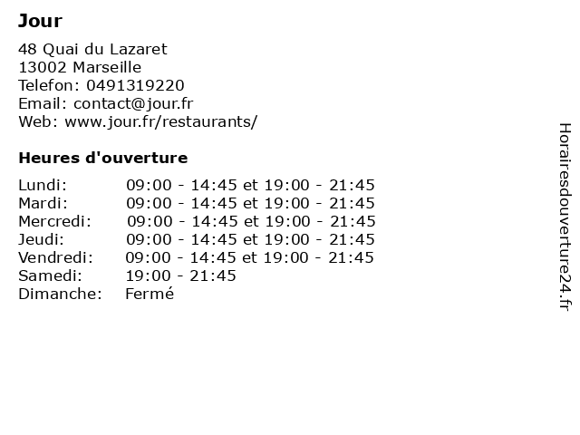 1 Jour (Distance: 0,13 km) 10 place de la Joliette, 13002 Marseille jour, restaurant, restauration, saladerie 2 Jour (Distance: 1,41 km) 1 La Canebière, 13001 Marseille boisson, jour, restaurant, saladerie, snacking 3 Un Jour Particulier (Distance: 0,58 km) 2 place Francis Chirat, 13002 Marseille d'organisation, de, décorations, jour, mariage, particulier, service, un 4 Un Jour Ailleurs (Distance: 1,28 km) 17 Cours Belsunce, 13231 Marseille ailleurs, alimentation, beauté & santé, culture & loisirs, enfants, high-tech, jour, maison & déco, mode, restaurants, un 5 Les Restos Du Coeur Marseille Accueil de Jour (Distance: 1,56 km) 34 Boulevard Boues, 13003 Marseille accueil, aides, alimentaire, coeur, de, du, jour, les, marseille, restos, santé, solidarité, soutien 6 Onepark / Garage Nuit-Et-Jour Parking (Distance: 1,82 km) - Boulevard Notre-Dame, 13006 Marseille et, garage, jour, nuit, onepark, parking, services |
