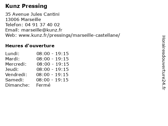 1 Kunz Pressing (Distance: 1,11 km) 444 Rue Paradis, 13008 Marseille kunz, lavage, nettoyage à sec, pressing, repassage, séchage 2 Kunz Pressing (Distance: 3,20 km) 57 Boulevard Romain Rolland, 13010 Marseille kunz, lavage, nettoyage à sec, pressing, repassage, séchage 3 KUNZ Pressing (Distance: 4,02 km) 124 Avenue de Hambourg, 13008 Marseille automatique, blanchisserie, kunz, lavage, nettoyage, pressing, service, séchage 4 Pressing 5àsec (Distance: 0,21 km) 11 Boulevard Baille, 13006 Marseille 5àsec, apprêt, expert textile, lavage, nettoyage, nettoyage à sec, pressing, repassage, sec 5 Pressing Clean 5 à Sécance (Distance: 1,05 km) 22 cours Pierre Puget, 13006 Marseille blanchissage, chemise, clean, entretien, jeans, lavage, nettoyage, pantalons, paris, pressing, robe, sécance, textiles, vetements 6 Pressing Astus Centre Bourse (Distance: 1,65 km) 17 cours Belsunce, 13001 Marseille astus, blanchissage, bourse, centre, chemise, entretien, jeans, lavage, nettoyage, pantalons, paris, pressing, robe, textiles, vetements |