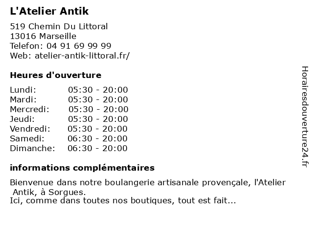 1 L'Atelier Antik (Distance: 1,87 km) 30 Plage De L'estaque, 13016 Marseille antik, café, l'atelier, magasin d’artisanat, snack, snack shop 2 L'Atelier Antik (Distance: 2,95 km) 14 Av. François Mitterrand, 13170 Les Pennes-Mirabeau antik, café, l'atelier, magasin d’artisanat, snack, snack shop 5 L'Atelier Antik (Distance: 10,98 km) 9 Av. Jacques Prévert, 13730 Saint-Victoret antik, café, l'atelier, magasin d’artisanat, snack, snack shop 6  |
