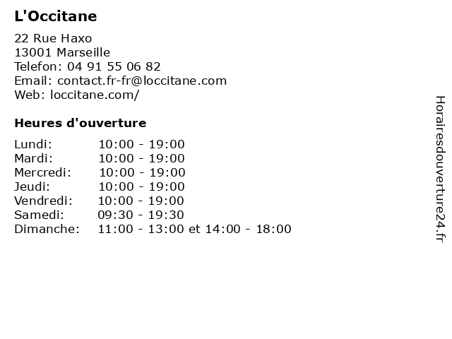 1 L'Occitane (Distance: 7,76 km) - Traverse de la Montre, 13011 Marseille cadeaux, l'occitane, lignes, parfum, produits de toilette, soin des cheveux, soin des hommes, soins du visage 2 L'Occitane (Distance: 14,21 km) - Chemin de la Grande Campagne, 13480 Cabriès cadeaux, l'occitane, lignes, parfum, produits de toilette, soin des cheveux, soin des hommes, soins du visage 3 L'OCCITANE EN PROVENCE (Distance: 0,01 km) 22 Rue Haxo, 13001 Marseille boutique de cadeaux, drugstores, en, l'occitane, provence 4 L'OCCITANE EN PROVENCE (Distance: 1,10 km) Square, 13001 Marseille boutique de cadeaux, en, l'occitane, magasin de produits cosmétiques, provence 5 L'Occitane en Provence (Distance: 1,80 km) 9 Quai du Lazare, 13002 Marseille cadeaux, en, l'occitane, lignes, parfum, produits de toilette, provence, soin des cheveux, soin des hommes, soins du visage 6 L'OCCITANE EN PROVENCE (Distance: 1,81 km) 9 Quai du lazaret, 13002 Marseille boutique de cadeaux, drugstores, en, l'occitane, provence |