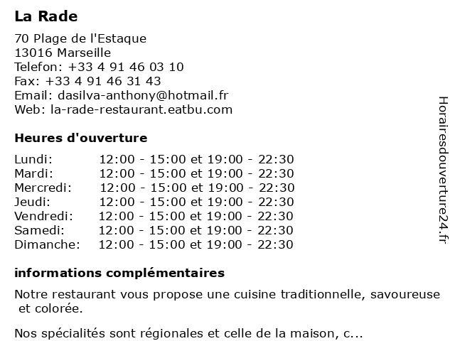 | Samedi | 12:00-15:00 et 19:00-22:30 |