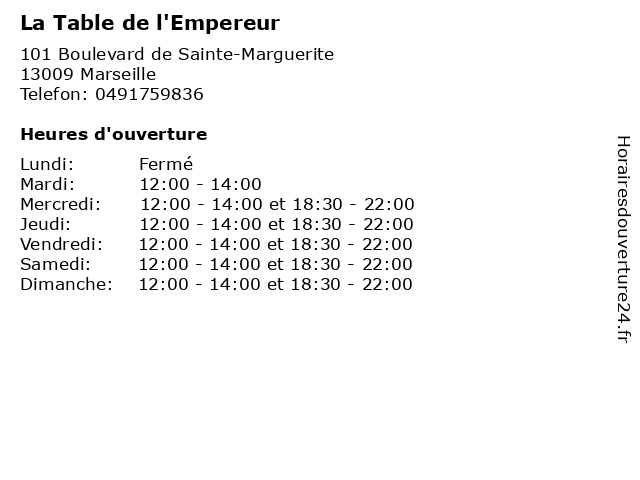 | Dimanche | 12:00-14:00 et 18:30-22:00 |