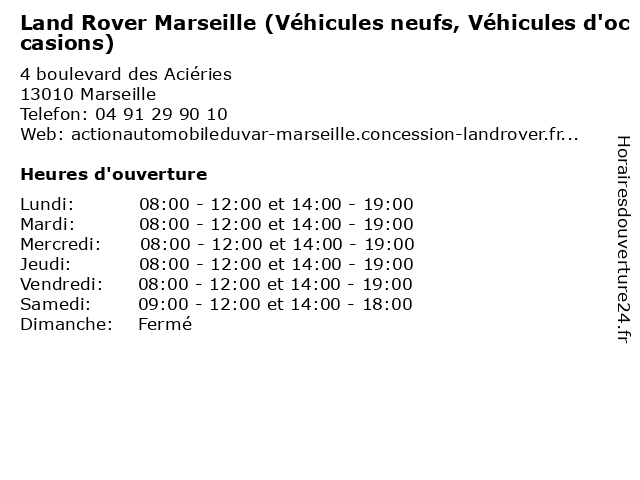 1 Land Rover Marseille (Atelier, Accessoires d'origine / Pièces de rechange) (Distance: 0,00 km) 4 boulevard des Aciéries, 13010 Marseille accessoires, atelier, d'origine, de, land, marseille, pièces, rechange, rover, services, véhicules 2 Land Rover Marseille (Distance: 0,19 km) 4 Boulevard des aciéries, 13010 Marseille concessionnaire automobile, concessionnaire de voitures d’occasion, land, marseille, rover 3 LAND ROVER MARSEILLE (Distance: 0,24 km) 4 Boulevard des Aciéries, 13010 Marseille land, marseille, rover 4 Land Architecture (Distance: 2,79 km) 42 Rue du Coq, 13001 Marseille aménagement, architecte, architecture, décoration, intérieur, land, maison, paysagiste 5 Agence Renault Catalans (occasions/Neufs) (Distance: 3,75 km) 0039 Rue Cesar Aleman, 13007 Marseille agence, automobile, catalans, occasions/neufs, renault, service 6 Games Land (Distance: 6,85 km) La Croix Rouge, 13013 Marseille games, land, logiciels, magasins, ordinateurs, ruco |