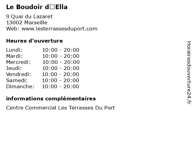1 Le Boudoir de la Major (Distance: 0,46 km) 15 Quai de la Joliette, 13002 Marseille beauté, boudoir, coiffure, coiffures, coloristes, de, la, le, major 2 Boudoir du Regard (Distance: 1,46 km) 1 rue Beauvau, 13001 Marseille beauté, boudoir, cils, du, institut, regard 3 Relais Colis® / LE BOUDOIR DE LOULOUTE (Distance: 8,95 km) 1 Boulevard Joseph Roubaud, 13380 Plan De Cuques boudoir, colis, colis®, de, le, louloute, relais, services postaux et de livraison 4 Agora (Distance: 0,00 km) 9 Quai du Lazaret, 13002 Marseille agora, cafe, enfants.chaussures, lingerie, mode hemmes, mode homme, restaurant 5 Aigle (Distance: 0,00 km) 9 Quai du Lazaret, 13002 Marseille aigle, cafe, enfants.chaussures, lingerie, mode hemmes, mode homme, restaurant 6 Alain Afflelou (Distance: 0,00 km) 9 Quai du Lazaret, 13002 Marseille afflelou, alain, cafe, enfants.chaussures, lingerie, mode hemmes, mode homme, restaurant |