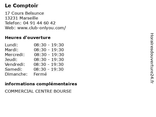 1 Le Comptoir (Distance: 5,56 km) 112 Avenue de Hambourg, 13008 Marseille cafe, chaussures, comptoir, enfants, homme, le, mode femme, restaurant, sport 2 Comptoir des Cotonniers (Distance: 0,08 km) 28 Rue de Bir Hakeim, 13231 Marseille accessoires, chaussures, comptoir, cotonniers, des, mode femme 3 COMPTOIR MARSEILLAIS DE BOURSE (Distance: 0,22 km) 22 La Canebière, 13001 Marseille bourse, comptoir, de, marseillais 4 Comptoir Central de l'Or (Distance: 0,25 km) 8-10 La Canebière, 13006 Marseille argent, central, comptoir, conversion, de, l'or, monnaie, pays 5 Le Comptoir de Mathilde (Distance: 0,26 km) 9 Rue Saint-Ferréol, 13001 Marseille boutique, cadeaux, chocolat, chocolaterie, comptoir, de, le, mathilde, épicerie 6 Le Comptoir Bellevue (Distance: 0,31 km) Port 34 Quai Du, 13002 Marseille bellevue, comptoir, restaurants, snack |