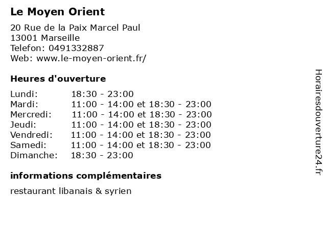 | Mercredi | 11:00-14:00 et 18:30-23:00 |