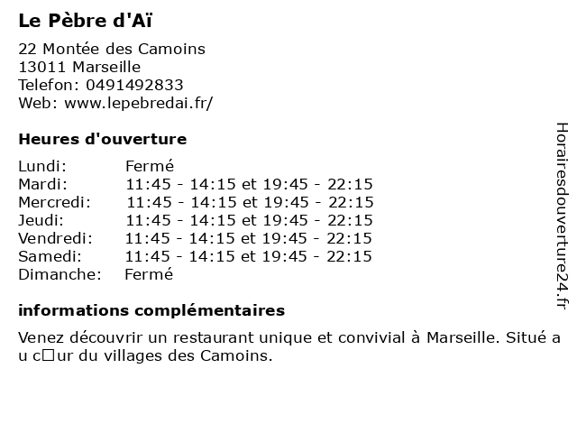 | 1 Le Pèbre d'Aï (Distance: 0,01 km) 22 Montée des Camoins, 13011 Marseille d'aï, le, pizza, pèbre, restaurante 2 Hôtel Restaurant Lou Pèbre d'Aï (Distance: 17,63 km) s/n Sur D.80, 83640 Plan-d'Aups-Sainte-Baume bar, bistro, bistrot, brasserie, café, d'aï, hotel, hôtel, lou, pub, pèbre, restaurant, restauration, resto 3 Lou Pèbre d'Aï (Distance: 52,08 km) 78 Avenue Joseph Garnier, 84360 Lauris aï, d'aï, lou, lpa, pèbre, restaurants 4 La Ferme de Pèbre (Distance: 53,61 km) 306 Route de Manosque, 83560 Vinon-sur-Verdon bio, de, ferme, fruits, la, légumes, pebre, pèbre, vinon-sur-verdon 5 Côté Coiffure (Distance: 0,14 km) - Place du Monuments, 13011 Marseille coiffure, cuisine, côté, les boissons, restaurants, restauration 6 Più La Valentine (Distance: 2,90 km) 184 Route des Trois Lucs à la Valentine, 13012 Marseille apéritif, boissons, italien, la, la valentine, pizzas, più, restaurant, valentine |