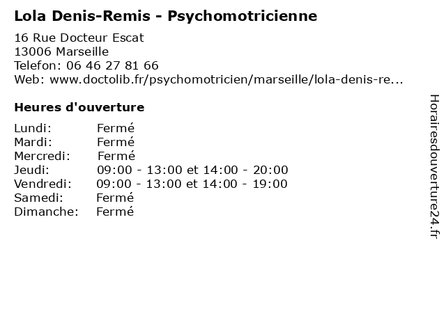 1 Virginie Cabane - Psychomotricienne (Distance: 0,44 km) 149 Rue Breteuil, 13006 Marseille cabane, motricite, psy, psychomotricienne, psyco, psycomotricien, virginie 2 Maître Marine Denis - Avocate (Distance: 1,15 km) 49 rue de la Paix Marcel Paul, 13001 Marseille avocate, avocats, civils, denis, droits, juridiques, marine, maître 3 Dr. Denis Heckenroth - Cardiologie (Consultation sur rendez-vous) (Distance: 1,35 km) 58 Boulevard Edouard Herriot, 13008 Marseille cardiologie, consultation, denis, docteur, dr., heckenroth, rendez, santé, sur, vous 4 Dr. Denis Heckenroth - Cardiologie (Autre) (Distance: 1,35 km) 58 Boulevard Edouard Herriot, 13008 Marseille autre, cardiologie, consultation, denis, docteur, dr., heckenroth, santé 5 Tarico David Denis Eddy (Distance: 2,67 km) Residence La Pauline Res Pauline b 23, 13009 Marseille david, denis, eddy, restaurants, tarico 6 Laura De Taillac - Psychomotricienne (Distance: 4,27 km) 46 Boulevard Kraemer, 13014 Marseille de, folie, laura, psychiatre, psychiatrie, psychiatrique, psychomotricienne, taillac |