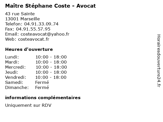 1 Maître Serge Coste - Avocat (Distance: 0,00 km) 43 rue Sainte, 13001 Marseille avocat, avocate, avocats, civils, coste, droits, juridiques, maître, serge 2 Maître Sébastien Coste - Avocat (Distance: 0,00 km) 43 rue Sainte, 13001 Marseille avocat, avocate, avocats, civils, coste, droits, juridiques, maître, sébastien 3 Maître Mathieu Coste - Avocat (Distance: 0,22 km) 36 rue Grignan, 13001 Marseille avocat, avocate, avocats, civils, coste, droits, juridiques, mathieu, maître 4 Pascal Coste (Distance: 0,61 km) 17 Cours Belsunce, 13001 Marseille bourse, centre, commercial, coste, marseille, pascal 5 Pascal Coste Endoume (Distance: 1,11 km) 142 rue d'Endoume, 13007 Marseille beauté, coiffure, coiffures, coloristes, coste, endoume, pascal 6 Françoise Coste - Sage-femme (Distance: 1,76 km) 147 boulevard Baille, 13005 Marseille consultation, coste, docteur, femme, francoise, françoise, med, medecine, medical, médecin, sage, traitement |