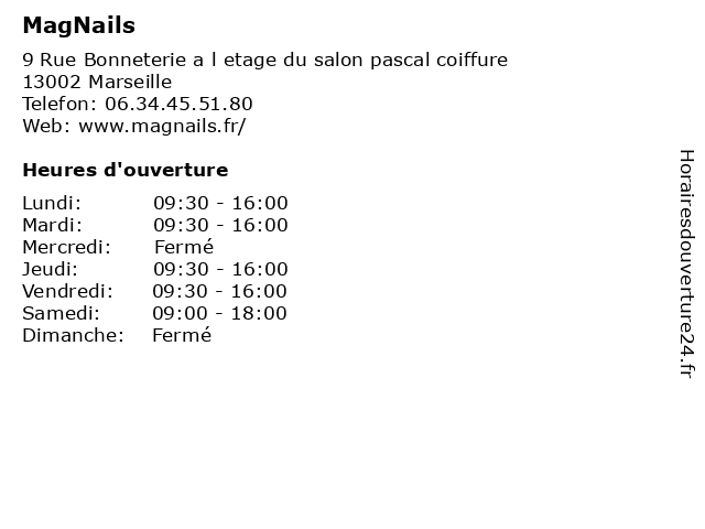 1 La Pose Beauté (Distance: 1,95 km) 1A A cours Franklin Roosevelt, 13001 Marseille arrangements, beauté, la, manucure, mode, pose, santé 2 Flore & Sens (Distance: 2,35 km) 72 Boulevard Notre Dame, 13006 Marseille arrangements, décorations, fleuriste, fleurs, flore, sens 3 Lôre Esthétique (Distance: 3,19 km) 4 Rue Antoine Pons, 13004 Marseille arrangements, beauté, esthétique, lôre, manucure, mode 4 Institut Monia (Distance: 4,43 km) 106 avenue de Saint Louis, 13015 Marseille arrangements, beauté, institut, manucure, mode, monia 5 XII ème Avenue (Distance: 4,45 km) 4 Boulevard Gassendi, 13012 Marseille arrangements, avenue, beauté, coiffure, manucure, mode, xii, ème 6 Ongles & Paillettes (Distance: 5,41 km) . avenue de La Fourragère, 13012 Marseille arrangements, beauté, manucure, mode, ongles, paillettes |