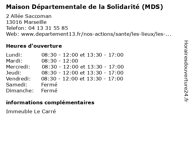 1 Maison Départementale de la Solidarité (MDS) (Distance: 3,10 km) 43 Avenue de la Viste, 13015 Marseille aide, assistance, de, départementale, enfance, information, la, maison, mds, public, service, sociale, solidarité 2 Maison Départementale de la Solidarité (MDS) (Distance: 7,83 km) 18 Avenue Robert Schuman, 13002 Marseille aide, assistance, de, départementale, enfance, information, la, maison, mds, public, service, sociale, solidarité 3 Maison Départementale de la Solidarité (MDS) (Distance: 9,51 km) 29 Avenue de Frais Vallon, 13013 Marseille aide, assistance, de, départementale, enfance, information, la, maison, mds, public, service, sociale, solidarité 4 Maison Départementale de la Solidarité (MDS) (Distance: 10,19 km) 66 Rue Saint Sébastien, 13006 Marseille aide, assistance, de, départementale, enfance, information, la, maison, mds, public, service, sociale, solidarité 5 Maison Départementale de la Solidarité (MDS) (Distance: 10,79 km) - Rue du Stade, 13700 Marignane aide, assistance, de, départementale, enfance, information, la, maison, mds, public, service, sociale, solidarité 6 Maison Départementale de la Solidarité (MDS) (Distance: 11,24 km) 250 boulevard Mireille Lauze, 13010 Marseille aide, assistance, de, départementale, enfance, information, la, maison, mds, public, service, sociale, solidarité |