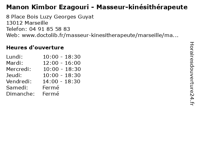 1 Manon Diassinous - Psychologue (Distance: 1,42 km) 7 Rue Gaston de Flotte, 13012 Marseille diassinous, manon, psy, psychiatre, psychologue, sante, soins 2 Dr Manon Hocedez - Médecin généraliste (Distance: 2,43 km) 264 Rue Saint-Pierre, 13005 Marseille consultation, docteur, dr, généraliste, hocedez, manon, med, médecin, traitement 3 Manon Perry - Ostéopathe - secrétariat (Distance: 2,64 km) 111 Boulevard Chave, 13005 Marseille manon, médecin, médecine, médical, ostéopathe, perry, pharmaceutique, secrétariat, traitement 4 Dr Manon Laforet - Néphrologue (Distance: 2,85 km) 147 boulevard Baille, 13005 Marseille consultation, docteur, dr, laforet, manon, med, médecin, médecine, néphrologue, traitement 5 Maître Manon Bonnet - Avocate (Distance: 3,91 km) 32 Rue Grignan, 13001 Marseille avocate, avocats, bonnet, civils, droits, juridiques, manon, maître 6 Dr Manon Romani - Chirurgien-dentiste (Distance: 3,96 km) 106 Boulevard de Paris, 13003 Marseille chirurgien, dentiste, dr, manon, médecin, médecine, médical, pharmaceutique, romani, traitement |