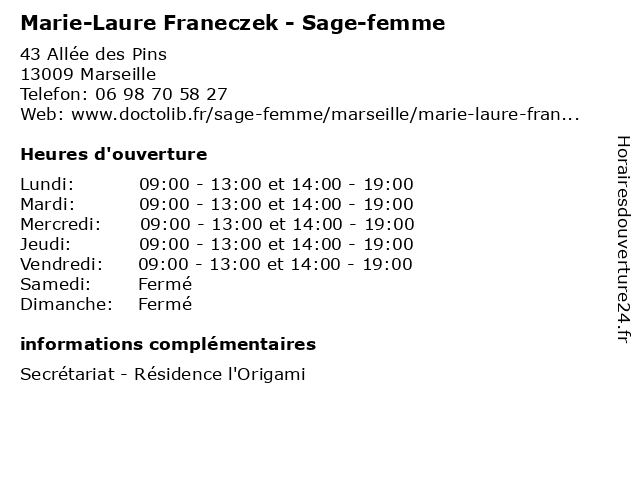 1 Marie-Laure Franeczek - Sage-femme (Distance: 2,49 km) 4 Rue Capitaine Jean Croisa, 13009 Marseille du, femme, franeczek, laure, marie, maternité, périnée, rééducation, sage, uro-gynécologique 2 Maître Marina Laure - Avocate (Distance: 1,63 km) 1 rue Jules Isaac, 13009 Marseille avocate, avocats, civils, droits, juridiques, laure, marina, maître 5 Maître Laure Bensimon - Avocate (Distance: 3,20 km) 258 avenue du Prado, 13008 Marseille avocate, avocats, bensimon, civils, droits, juridiques, laure, maître 6 Dr Laure Swiader - Spécialiste en médecine (Distance: 4,33 km) 278 Rue Saint-Pierre, 13005 Marseille consultation, docteur, dr, en, laure, med, médecin, médecine, spécialiste, swiader, traitement |