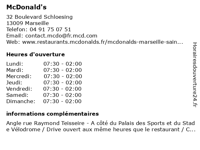 1 McDonald's (Distance: 2,14 km) 211-213 rue de Rome, 13006 Marseille burgers, fast, food, hamburgers, mcdonald's, rapide, restaurant, restauration 2 McDonald's (Distance: 2,44 km) 13 Rue Madon, 13005 Marseille burgers, fast, food, hamburgers, mcdonald's, rapide, restaurant, restauration 3 McDonald's (Distance: 2,73 km) 122 Avenue de Hambourg, 13008 Marseille burgers, fast, food, hamburgers, mcdonald's, rapide, restaurant, restauration 4 McDonald's (Distance: 2,75 km) - Place Félix Baret, 13006 Marseille burgers, fast, food, hamburgers, mcdonald's, rapide, restaurant, restauration 5 McDonald's (Distance: 3,24 km) 79 Canebière, 13001 Marseille burgers, fast, food, hamburgers, mcdonald's, rapide, restaurant, restauration 6 McDonald's (Distance: 3,27 km) 7 Quai de Rive Neuve, 13001 Marseille burgers, fast, food, hamburgers, mcdonald's, rapide, restaurant, restauration |