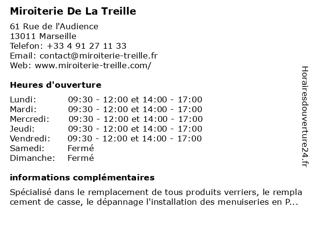 1 Miroiterie de la Treille (Distance: 10,82 km) 29 Rue Charles Tellier, 13014 Marseille de, la, miroiterie, treille 2 Brico-vitre.com - Miroiterie en Ligne (Distance: 0,83 km) 74 Route des Camoins, 13011 Marseille brico, bricovitre, bricovitre.com, dépannage, en, ligne, miroiterie, porte, verre, vitre.com, vitrerie 4 Miroiterie Rodriguez (Distance: 7,50 km) 26 Avenue des Chutes Lavie, 13004 Marseille miroiterie, rodriguez 5 Miroiterie Habitat Sécurité (Distance: 7,87 km) 167 Rue du Rouet, 13008 Marseille dépannage, habitat, miroiterie, porte, securite, serrurerie, sécurité, verre, vitrerie 6 |