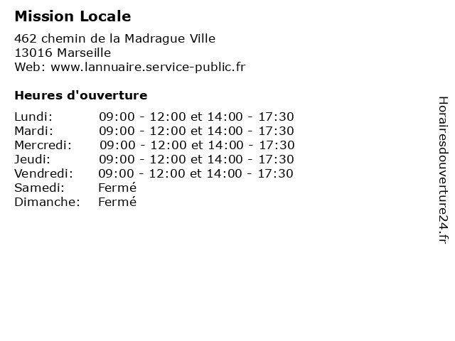 1 Mission Locale (Distance: 2,01 km) 15 Avenue André Roussin, 13016 Marseille insertion, jeunes, locale, marseille, mission, professionnelle 2 Mission Locale (Distance: 3,62 km) . Avenue François-Mitterrand, 13170 Les Pennes Mirabeau administration, assoc, locale, mission, services, services publics 3 Mission Locale (Distance: 4,16 km) . avenue Georges Braque, 13014 Marseille administration, assoc, locale, mission, services, services publics 4 Mission Locale (Distance: 4,24 km) . Place Victorin-Isnard / Avenue François-Mitterrand, 13170 Les Pennes-Mirabeau insertion, jeunes, locale, mission, pennes-mirabeau, professionnelle 5 Mission Locale (Distance: 5,21 km) 8 rue des Consuls, 13002 Marseille administration, assoc, locale, mission, services, services publics 6 Mission Locale (Distance: 5,44 km) 62 La Canebière, 13001 Marseille administration, assoc, locale, mission, services, services publics |