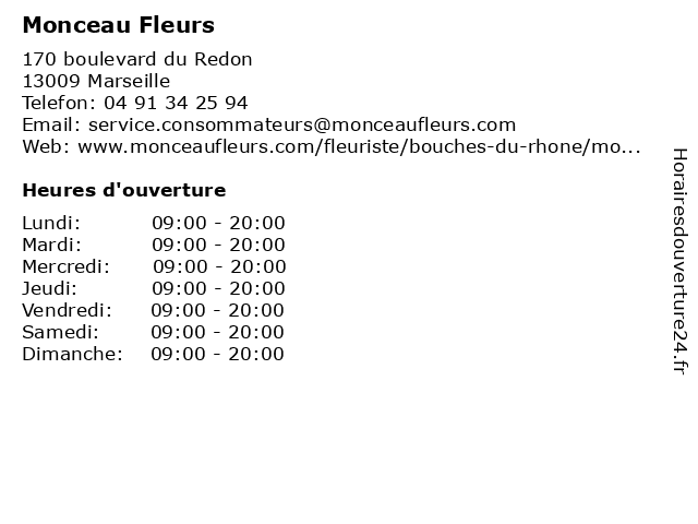 3 Monceau Fleurs (Distance: 10,58 km) 115 Chemin de l'afférage, 13190 Allauch fleuriste, fleurs, magasin, monceau 4 Monceau Fleurs (Distance: 17,09 km) 257 Avenue Ernest Subilia, 13600 La Ciotat boutique, cadeaux, fleuriste, fleurs, monceau, offrir 6 Flora Nature et Fleurs (Distance: 3,46 km) 41 Boulevard de Saint-Loup, 13010 Marseille bouquet, composition, et, fleuriste, fleurs, flora, nature |