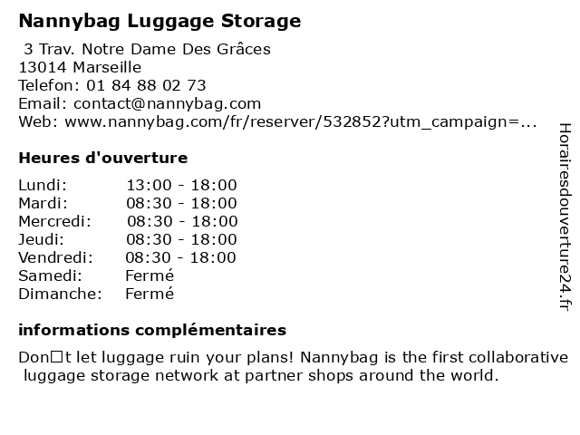 1 Nannybag Luggage Storage (Distance: 1,51 km) 55 Av. De La Rose, 13013 Marseille luggage, nannybag, storage 2 Nannybag Luggage Storage (Distance: 2,28 km) 68 Av. De Saint-just, 13013 Marseille luggage, nannybag, storage 3 Nannybag Luggage Storage (Distance: 4,03 km) 160 Chemin De La Madrague-ville, 13015 Marseille luggage, nannybag, storage 4 Nannybag Luggage Storage (Distance: 4,04 km) 75 Bd National, 13003 Marseille luggage, nannybag, storage 5 Nannybag Luggage Storage (Distance: 4,10 km) 65 Rue Honnorat, 13003 Marseille luggage, nannybag, storage 6 Nannybag Luggage Storage (Distance: 4,35 km) 117 Avenue Camille Pelletan, 13003 Marseille luggage, nannybag, storage |