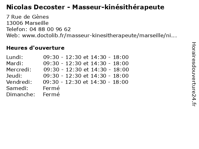 | Mercredi | 09:30-12:30 et 14:30-18:00 |