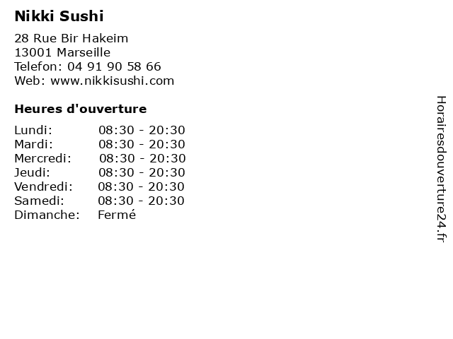 1 Nikki Sushi (Distance: 15,54 km) 16 Cours du Maréchal Foch, 13400 Aubagne asiatique, gastronomie, japonais, nikki, restaurant, restauration, sushi 2 Sushi or Not Sushi (Distance: 0,20 km) 11 Rue Henri Barbusse, 13001 Marseille apéritif, boissons, not, or, restaurant, sushi 4 Sushi Room (Distance: 0,24 km) 50 Rue Vacon, 13001 Marseille algues, japonais, livraison, makis, poissons, restaurant, riz, room, sushi, sushis 5 Sushi Shop Marseille Lulli (Distance: 0,51 km) 24 Rue Lulli, 13001 Marseille lulli, marseille, shop, sushi 6 Kyo Sushi (Distance: 0,66 km) 15 avenue du Prado, Metro / Parking Castellane, 13006 Marseille bistrot, de la nourriture, kyo, restaurant, sushi |