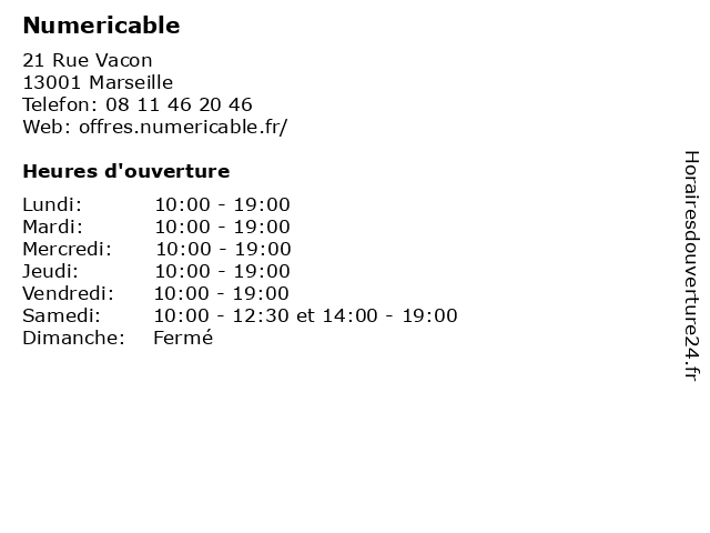1 Numericable (Distance: 0,73 km) 57 Place Jean Jaurès, 13005 Marseille internet, mobile, multimedia, numericable, services, telephone 2 Numericable (Distance: 1,07 km) 110 Boulevard National, 13001 Marseille internet, mobile, multimedia, numericable, services, telephone 3 Numericable (Distance: 3,00 km) 54 Rue Negresko, 13008 Marseille internet, mobile, multimedia, numericable, services, telephone 4 Numericable (Distance: 4,04 km) . Avenue Prosper Mérimée, 13014 Marseille accessoires, beaute&sante, cafe, chaussures, enfants, mode femmes, mode hommes, numericable, optique, restaurant, service, sport 5 shopme (Distance: 0,37 km) La Canebière 75, 13001 Marseille anneau lumineux pour telephone, baffle jbl, camera espion, cienture, ecouteur avec fil, ecouteure iphone, ecouteure sans fil, etui iphone 12, sac femme, sacoche streetwear, shopme 6 Cybertek (Distance: 7,40 km) 70 Avenue des Peintres Roux, 13012 Marseille accessoire, cybertek, gamme, multimedia |