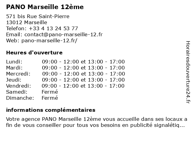 1 Pano Sign'Service (Distance: 0,01 km) 571 bis rue Saint-Pierre, 13012 Marseille agence, pano, publicitaire, sign'service 2 Intermarché station-service Marseille 12ème arrondissement (Distance: 0,66 km) Rue Gaston de Flotte, 13012 Marseille 12ème, arrondissement, intermarché, marseille, service, station 3 La Table du 12ème (Distance: 1,47 km) 66 Rue Saint Jean du Désert, 13012 Marseille 12ème, bar, bistrot, brasserie, café, cuisine, du, la, restaurant, restauration, table 4 Ménage et repassage à domicile - Shiva Marseille 12ème - Saint-Barnabé (Distance: 1,62 km) 12 Avenue de Saint-Julien, 13012 Marseille 12ème, barnabé, domicile, et, marseille, ménage, repassage, saint, shiva 5 Mairie de Marseille - 11ème et 12ème Arrondissements (Distance: 1,83 km) . Avenue Boulaya-d'Arnaud, 13012 Marseille 11e, 11ème, 12e, 12ème, administration, arrondissements, assoc public, de, et, mairie, marseille 6 |