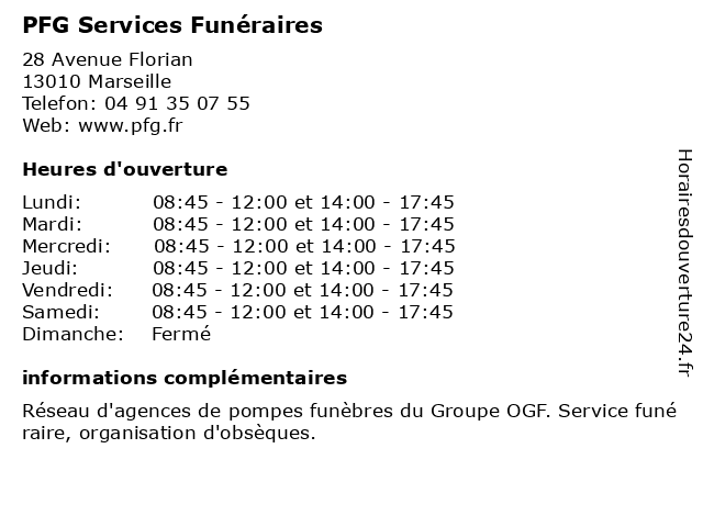 1 PFG Services Funéraires (Distance: 2,88 km) 27 Boulevard de Louvain, 13008 Marseille funeraires, funéraires, marbrerie, pfg, plaque funéraire, pompes funèbres, services 2 PFG Services Funéraires (Distance: 7,38 km) 167 Avenue de la Libération, 13380 Plan-de-Cuques funeraires, funéraires, marbrerie, pfg, plaque funéraire, pompes funèbres, services 3 PFG Services Funéraires (Distance: 13,15 km) 155 Avenue François Mitterrand, 13170 Les-Pennes-Mirabeau funeraires, funéraires, marbrerie, pfg, plaque funéraire, pompes funèbres, services 4 Pompes funèbres PFG MARSEILLE 10 (Distance: 0,01 km) 28 Avenue Florian, 13010 Marseille 10, avis de décès, crémation, entretien de sépulture, fleurs deuil, formalités après obsèques, funèbres, inhumation, marbrerie, marseille, monument funéraire, pfg, pompes, pompes funèbres, prévoyance obsèques 5 Pompes Funèbres Générales (PFG) (Distance: 1,94 km) 68 Boulevard Lazer, 13010 Marseille administration, assoc, associations, aux, bussières, d'information, de, des, dédié, funèbres, greffe, générales, information, local, locale, mairie, mission, personnes, pfg, pompes 6 PFG Services Funeraires (Distance: 2,88 km) 127 Avenue du 24 avril 1915, 13012 Marseille funeraires, marbrerie, pfg, plaque funéraire, pompes funèbres, services |