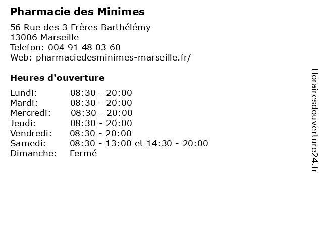 1 Pharmacie des Minimes (Distance: 0,00 km) 56 rue des Trois Frères Barthélémy, 13006 Marseille des, herboristerie, minimes, médicaments, paramédical, parapharmacie, pharmacie, pharmacien, santé, traitements 2 Pharmacie du Marché des Capucins (Distance: 0,63 km) 17 Rue Rodolphe Pollak, 13001 Marseille capucins, des, du, herboristerie, marché, médicaments, paramédical, parapharmacie, pharmacie, pharmacien, santé, traitements 3 Pharmacie Planche (Distance: 0,68 km) 1 Boulevard de la Libération, 13001 Marseille herboristerie, médicaments, paramédical, parapharmacie, pharmacie, pharmacien, planche, santé, traitements 4 Pharmacie de la Poste (Distance: 1,20 km) 15 Rue Colbert, 13001 Marseille de, herboristerie, la, médicaments, paramédical, parapharmacie, pharmacie, pharmacien, poste, santé, traitements 5 Pharmacie du Métro Saint-Barnabé (Distance: 3,11 km) 58 boulevard Gassendi, 13012 Marseille barnabé, du, herboristerie, médicaments, métro, paramédical, parapharmacie, pharmacie, pharmacien, saint, santé, traitements 6 Pharmacie Guenancia (Distance: 3,78 km) 365 Avenue de Mazargues, 13008 Marseille guenancia, herboristerie, médicaments, paramédical, parapharmacie, pharmacie, pharmacien, santé, traitements |
