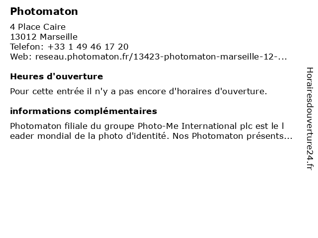 1 Photomaton (Distance: 0,17 km) PLACE ST BARNABE METRO, 13012 Marseille photomaton