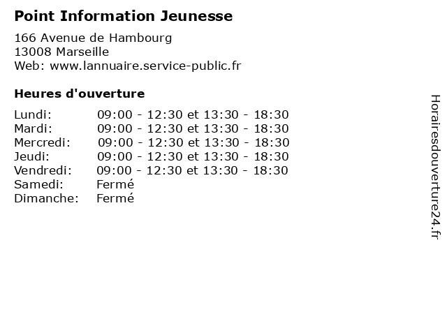 1 Point Information Jeunesse (Distance: 0,82 km) 213 Chemin De Morgiou, 13009 Marseille administration, assoc, information, jeunesse, point, services, services publics 2 Point Information Jeunesse (Distance: 0,96 km) 16 Allée Albeniz, 13008 Marseille administration, assoc, information, jeunesse, point, services, services publics 3 Point Information Jeunesse (Distance: 1,57 km) 286 Avenue de Mazargues, 13008 Marseille administration, assoc, information, jeunesse, point, services, services publics 4 Point Information Jeunesse (Distance: 2,13 km) 38 Rue Raphaël-Ponson, 13008 Marseille administration, assoc, information, jeunesse, point, services, services publics 5 Point Information Jeunesse (Distance: 3,00 km) 6 Boulevard de la Verrerie, 13008 Marseille administration, assoc, information, jeunesse, point, services, services publics 6 Point Information Jeunesse (Distance: 3,37 km) 7 Rue de Bénédetti, 13008 Marseille administration, assoc, information, jeunesse, point, services, services publics |