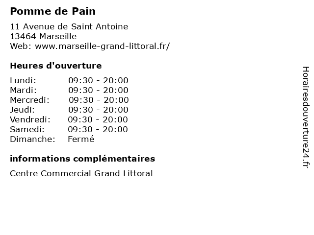 1 Pomme de Pain (Distance: 6,48 km) 9 quai du Lazaret, 13002 Marseille bistrot, brasserie, café, de, pain, pomme, restaurant, restauration 2 Pain et partage Marseille (Distance: 2,54 km) 25 Boulevard Ledru Rollin, 13015 MARSEILLE et, marseille, pain, partage 3 Le Pain Des Marronniers (Distance: 6,06 km) 56 Boulevard Louis Villecroze, 13014 Marseille aux, boulangeries, delices, détail, grands, marronniers, pain 5 Le Bar à Pain (Distance: 7,70 km) 18 Cours Joseph Thierry, 13001 Marseille bar, bio, boissons, boulangerie, café, déjeuner, le, pain, petit déjeuner, restauration 6 |