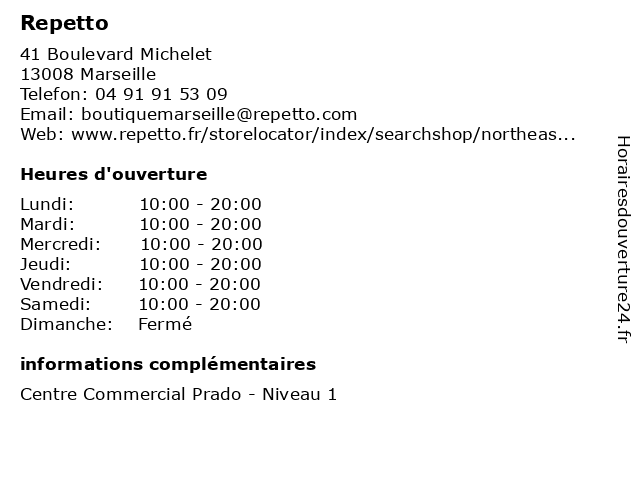 1 Repetto (Distance: 2,98 km) 24 rue Francis Davso, 13001 Marseille chaussures, garde-robe, maroquinerie, parfum, repetto 2 Repetto - MADEMOISELLE DANSE (Distance: 1,13 km) 11 rue de Cassis, 13008 Marseille chaussures, danse, garde-robe, mademoiselle, maroquinerie, parfum, repetto 3 Dr Andrea Repetto - Chirurgien-dentiste (Distance: 2,19 km) 27 Boulevard Jean Moulin, 13005 Marseille andrea, chirurgien, consultation, dentiste, docteur, dr, med, médecin, repetto, traitement 4 Repetto - PRINTEMPS TERRASSES DU PORT (Distance: 4,79 km) 9 quai du Lazaret, 13002 Marseille chaussures, du, garde-robe, maroquinerie, parfum, port, printemps, repetto, terrasses 5 Repetto - PRINTEMPS LA VALENTINE (Distance: 7,84 km) n/a La Valentine, 13011 Marseille chaussures, garde-robe, la, maroquinerie, parfum, printemps, repetto, valentine 6 Lush (Distance: 0,00 km) 41 Boulevard Michelet, 13008 Marseille beauté, centre, commercial, lush, prado, savons au poids |