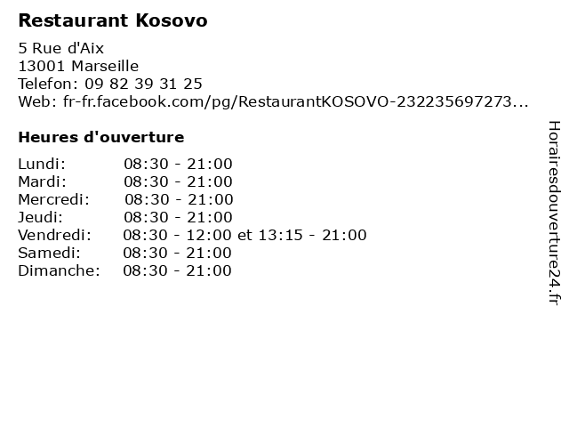 | Vendredi | 08:30-12:00 et 13:15-21:00 |