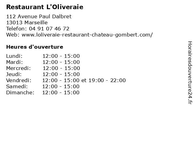 1 L'Oliveraie - Restaurant Chateau Gombert (Distance: 0,00 km) 112 Avenue Paul Dalbret, 13013 Marseille boissons, chateau, cuisine, gombert, l'oliveraie, repas, restaurant, traditionnelle 2 L'Oliveraie - Restaurant Chateau Gombert (Distance: 0,02 km) 112 Avenue Paul Dalbret, 13013 Marseille bar, bistro, bistrot, brasserie, café, chateau, gombert, l'oliveraie, restaurant, restauration 3 Agence de l'Oliveraie Prestige (Distance: 38,69 km) 3 Avenue Gallieni, 83110 Sanary-sur-Mer agence, de, l'oliveraie, prestige 4 Agence de L'Oliveraie Premium (Distance: 38,70 km) 1 Avenue Gallieni, 83110 Sanary-sur-Mer agence, de, gestion, immobilier, immobiliers, l'oliveraie, premium, transaction 5 TotalEnergies - SAS L' OLIVERAIE (Distance: 57,02 km) 46 AV. DES ALPES, 04800 GREOUX LES BAINS gas station, l', oliveraie, sas, station service, tankstelle, total, totalenergies 6 Brasserie des Martégaux (Distance: 3,15 km) 179 Avenue des Olives, 13013 Marseille brasserie, des, martégaux, pizza, restaurante |