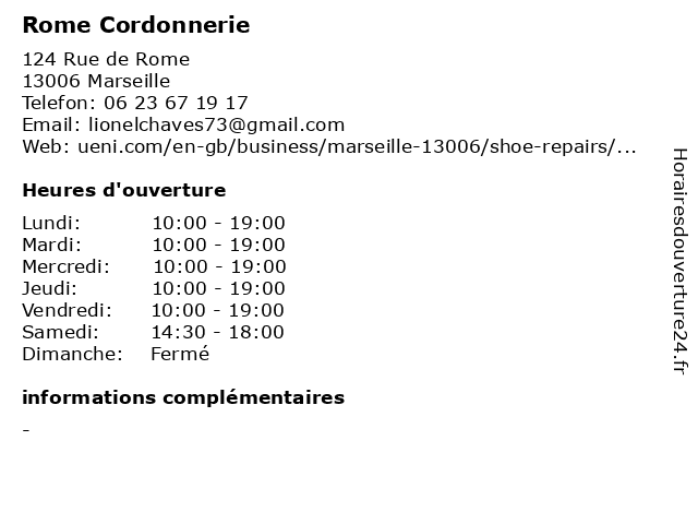1 Hotel Rome et Saint Pierre (Distance: 0,01 km) 7 Cours Saint-Louis, 13001 Marseille bar, et, hotel, pierre, restaurant, rome, saint, service 2 Cordonnerie Venture (Distance: 0,31 km) 10 Rue Venture, 13001 Marseille chaussures, cordonnerie, venture 3 Cordonnerie Cemieux Sarl silver (Distance: 0,56 km) 26 Rue Fortia, 13001 Marseille cemieux, chaussure, cordonnerie, cordonnerie cemieux sarl silver, sarl, silver 4 Onepark / Rome Parking (Distance: 0,72 km) 7 Rue Sylvabelle, 13006 Marseille onepark, parking, rome, services 5 Grande Pharmacie de Rome (Distance: 0,75 km) 122 rue de Rome, 13006 Marseille de, grande, herboristerie, médicaments, paramédical, parapharmacie, pharmacie, pharmacien, rome, santé, traitements 6 Serrurerie Cordonnerie Manukyan (Distance: 1,71 km) 10 Boulevard Jeanne d'Arc, 13005 Marseille cordonnerie, manukyan, serrurerie |
