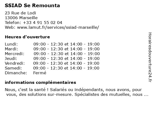 1 Soins Liberté / Pro Santé SSIAD (Distance: 0,87 km) 8 Rue Briffaut, 13005 Marseille liberté, pro, santé, soins, ssiad 2 Croix-Rouge Française (SSIAD-Bureaux) (Distance: 1,09 km) 1 Rue Du Docteur Simone Sedan, 13355 Marseille 05 aide, bureaux, creche, croix, française, prévention, rouge, rééducation, santé, services, ssiad 3 Croix-Rouge Française (SSIAD-Intervention) (Distance: 1,09 km) 1 Rue Du Docteur Simone Sedan, 13355 Marseille 05 aide, creche, croix, française, intervention, prévention, rouge, rééducation, santé, services, ssiad 4 Service de Soins à Domicile SSIAD Hôpital Saint Joseph Marseille (Distance: 1,71 km) 29 A Boulevard de Louvain, 13008 Marseille de, domicile, hôpital, joseph, marseille, saint, service, soins, ssiad 5 Grand Conseil de la Mutualité - Généraliste, Spécialiste, Ophtalmologie, Dentaire, SSIAD (secrétariat ) (Distance: 2,42 km) 15 Avenue de Saint-Barnabé, 13004 Marseille conseil, consultation, de, dentaire, docteur, grand, généraliste, la, mutualité, ophtalmologie, santé, secrétariat, spécialiste, ssiad 6 Aisance A Dom'SSIAD De Saint Marcel (Distance: 4,12 km) 546 Boulevard Mireille Lauze, 13011 Marseille aisance, de, dom'ssiad, marcel, saint |