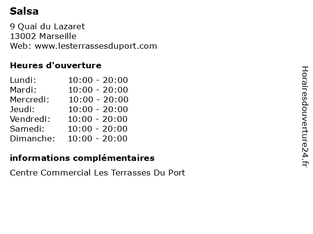 1 Salsa (Distance: 4,50 km) 41 Boulevard Michelet, 13008 Marseille accessoires, boutique, centre, commercial, jeans, prado, prêt-à-porter, salsa, vetements 2 Fabio Salsa (Distance: 1,27 km) 17 Cours Belsunce, 13231 Marseille alimentation, beauté & santé, culture & loisirs, enfants, fabio, high-tech, maison & déco, mode, restaurants, salsa 4 Life Club / Activités - Salsa cubaine debutant (Distance: 2,86 km) 40 rue du Dr escat, 13006 Marseille activités, club, cubaine, debutant, exercise, fitness, health, life, outdoor, physical activities, salsa, sports 5 Life Club / Activités - Salsa cubaine intermidiare (Distance: 2,86 km) 40 rue du Dr escat, 13006 Marseille activités, club, cubaine, exercise, fitness, health, intermidiare, life, outdoor, physical activities, salsa, sports 6 Salsa 13 Emocion (Distance: 3,45 km) 1 Rue de Cadolive, 13004 Marseille 13, académie, cours, danse, emocion, marseille, salsa, école |