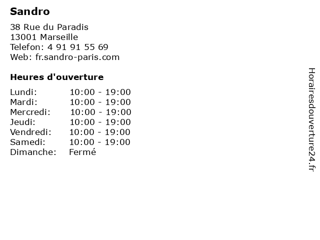 1 Sandro (Distance: 0,12 km) 48 Rue Saint Ferréol, 13208 Marseille accessoires, chaussures, femme, homme, mode, sandro 2 Sandro (Distance: 0,13 km) 40 Rue Saint Ferréol, 13001 Marseille accessoires, chaussures, femme, homme, mode, sandro 3 Sandro (Distance: 0,18 km) 68 Rue du Paradis, 13006 Marseille accessoires, chaussures, femme, homme, mode, sandro 4 Sandro (Distance: 0,97 km) , Les Terrasses du Port, 13002 Marseille accessoires, chaussures, femme, homme, mode, sandro 5 Sandro (Distance: 1,76 km) 9 Quai du Lazaret, 13002 Marseille cafe, enfants.chaussures, lingerie, mode hemmes, mode homme, restaurant, sandro 6 Sandro (Distance: 1,83 km) . Les Terrasses du Port, 13002 Marseille accessoires, chaussures, femme, homme, mode, sandro |