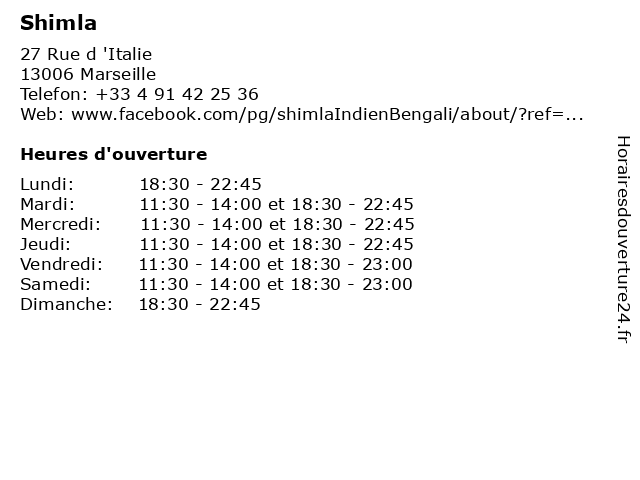 | Mercredi | 11:30-14:00 et 18:30-22:45 |
